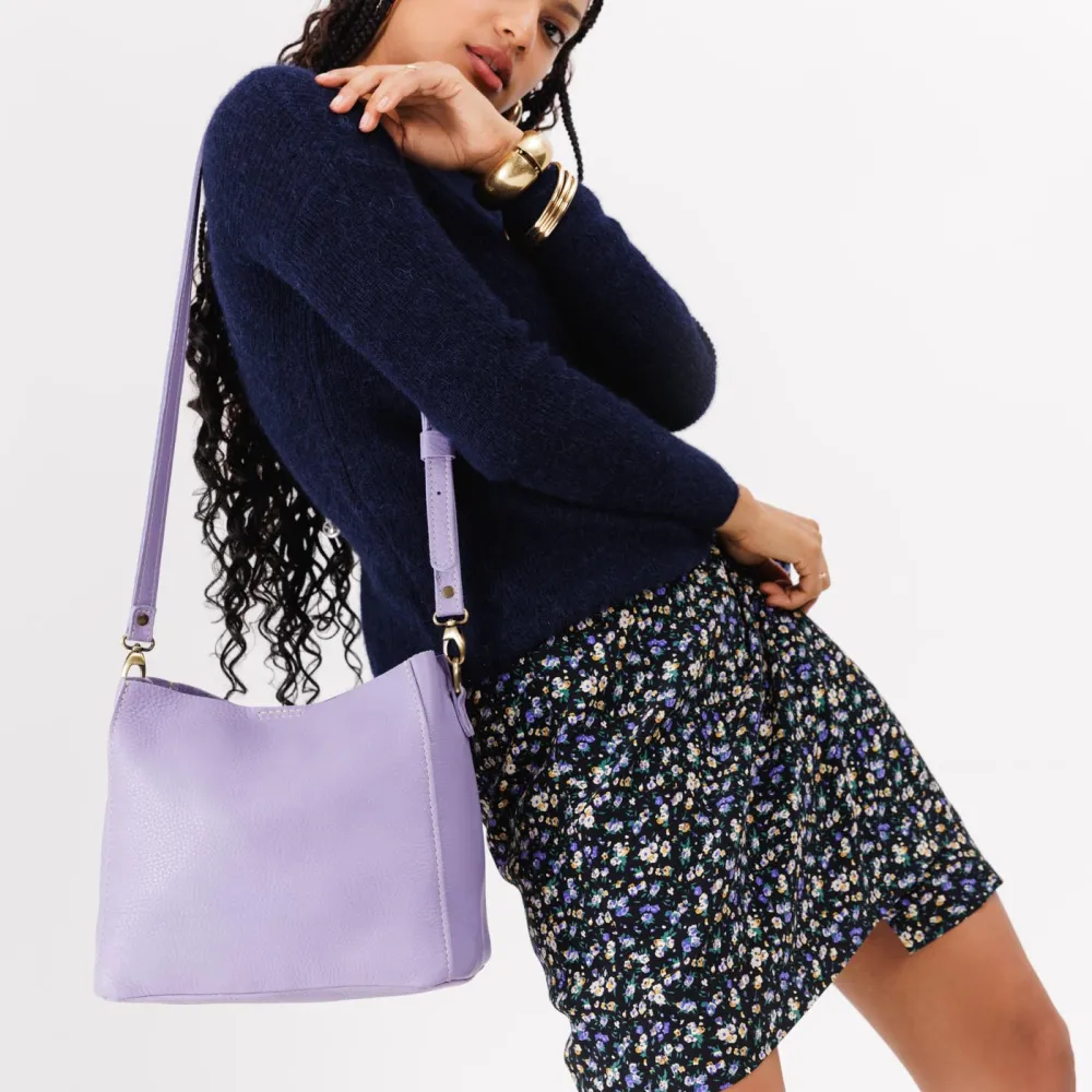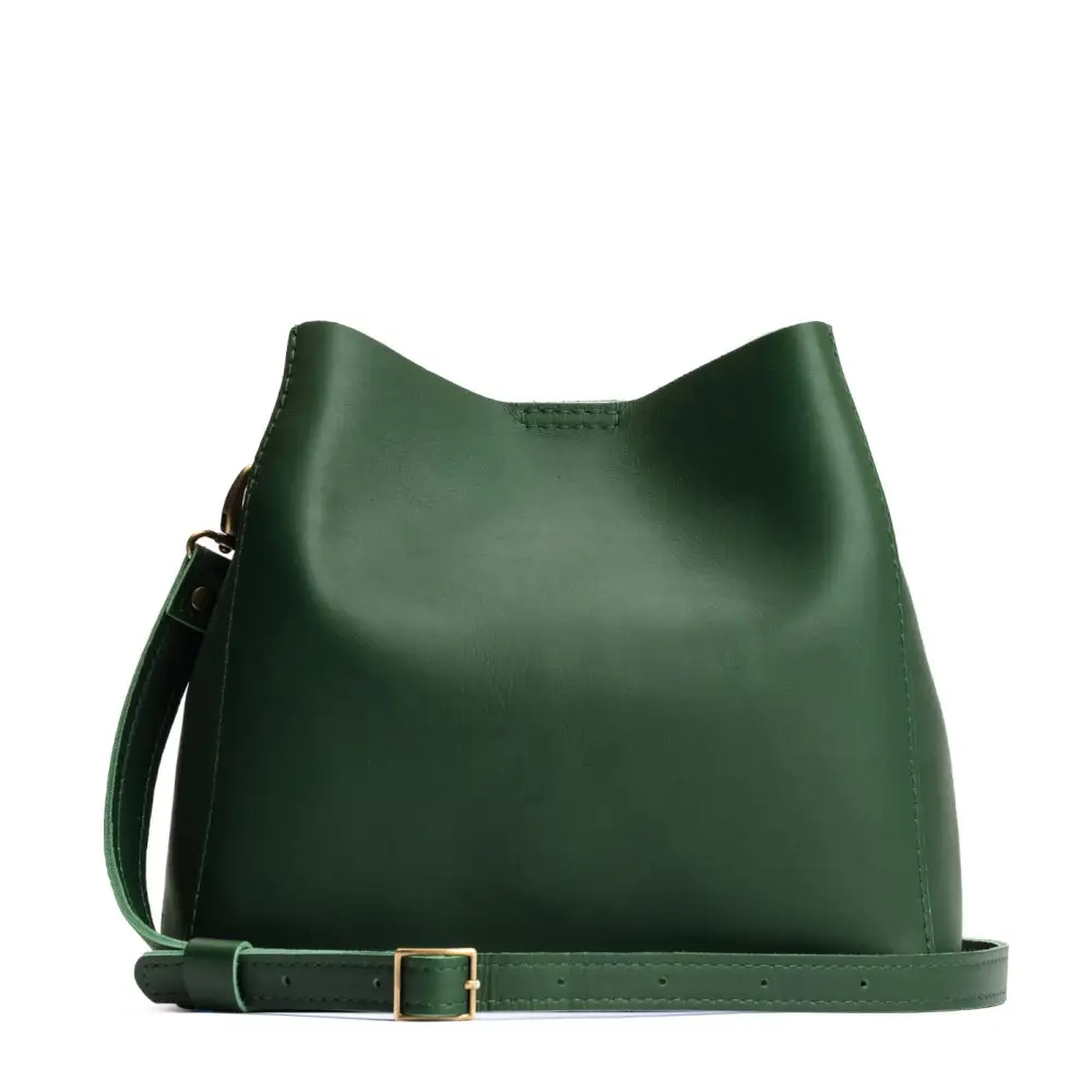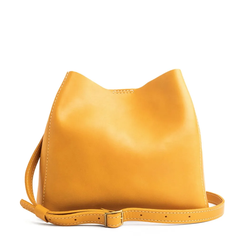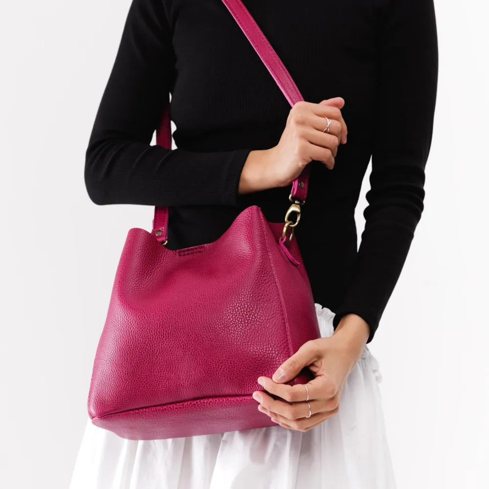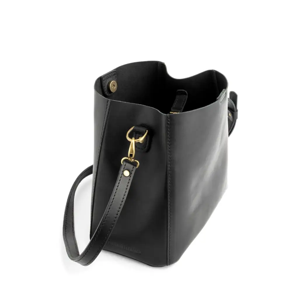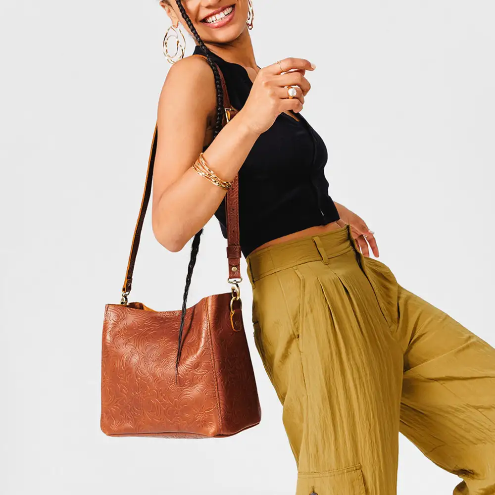 - Spacious bucket shape with delicate brass-toned hardware accents