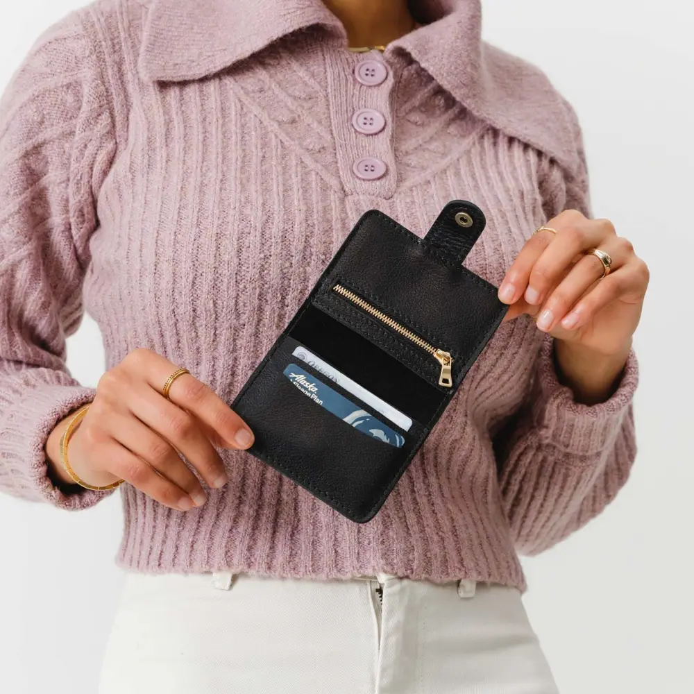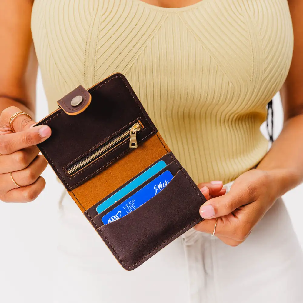 - Features 2 card slots, 2 cash slots, and a zippered coin pocket