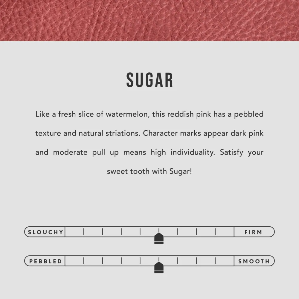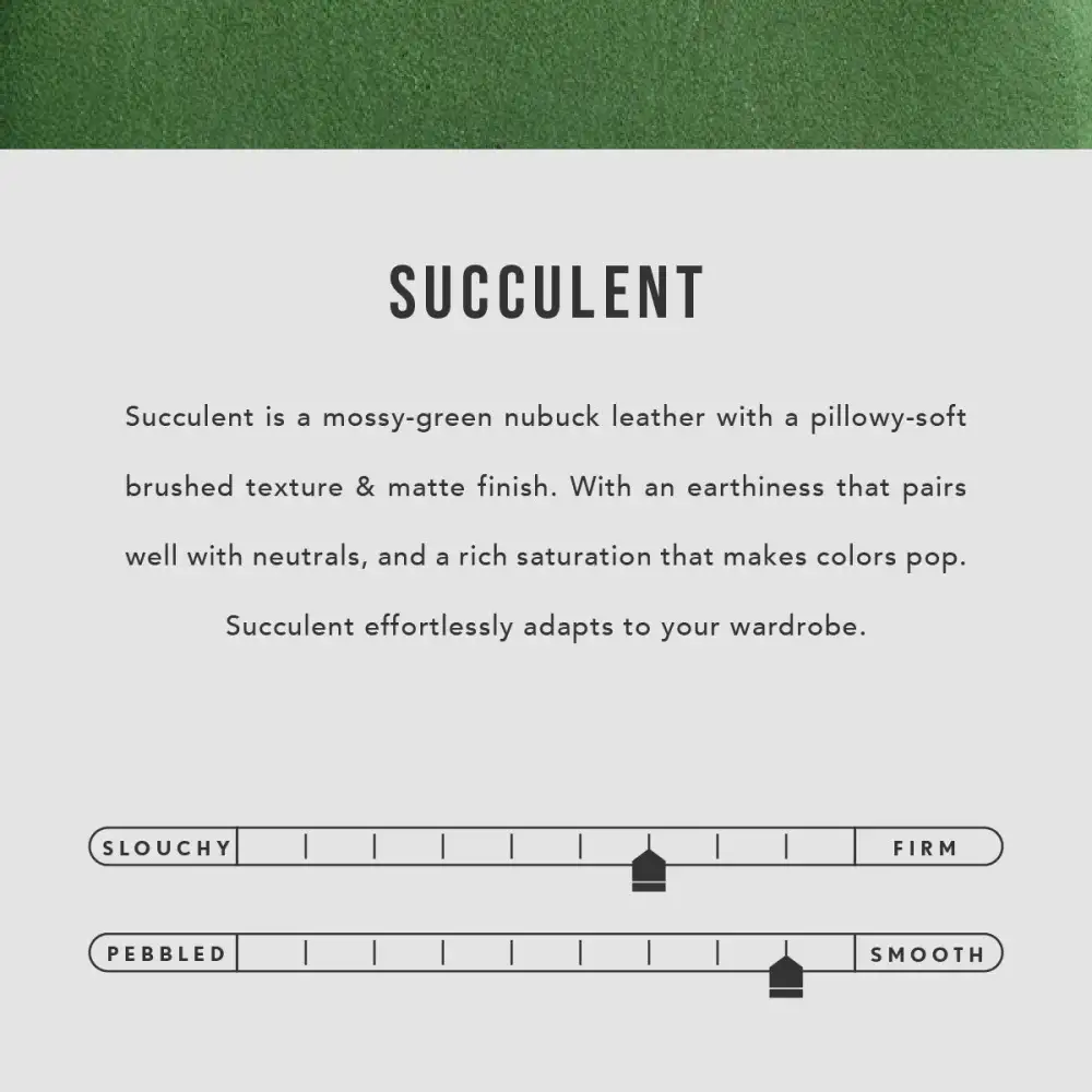 Suede: Our suede leather begins with an intricate process: the hide is split to separate the soft underside from the top layer. This top layer is then tanned, buffed, sanded, and dyed to create the signature velvety texture that defines high-quality suede. Naturally slouchy and pliable, suede leather ages gracefully, developing a rich patina that tells its own story over time. Most natural imperfections are gently smoothed away during production, while subtle traces - like healed veining and the soft, napped surface - are preserved to celebrate the leather’s unique character and charm.