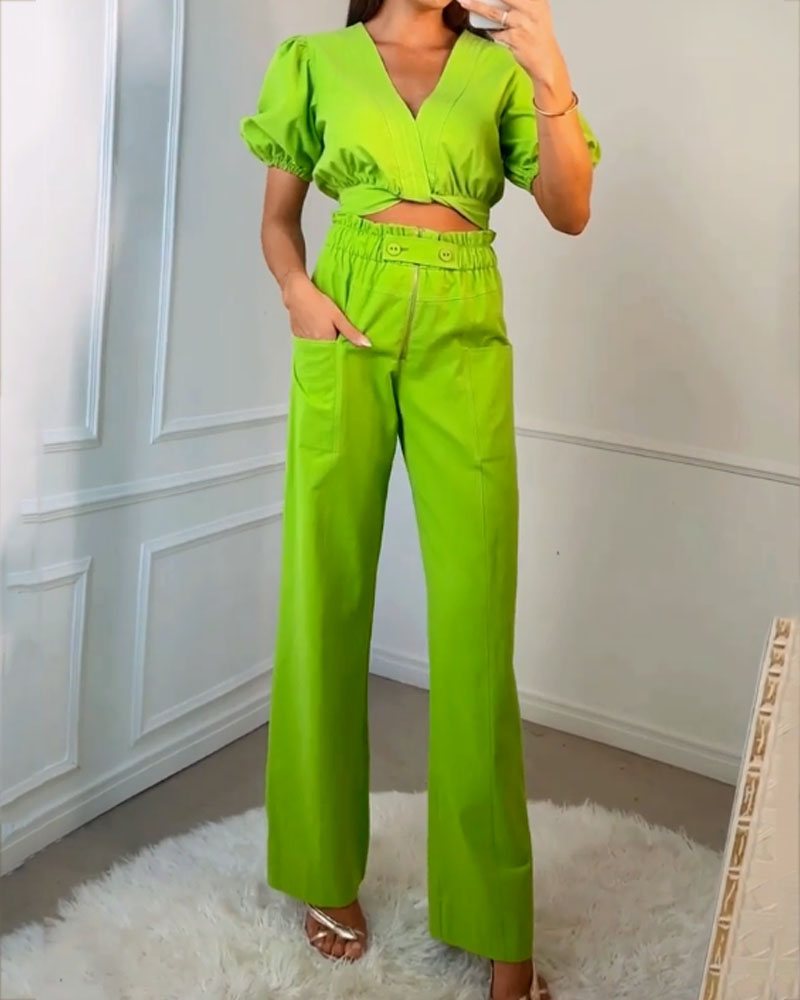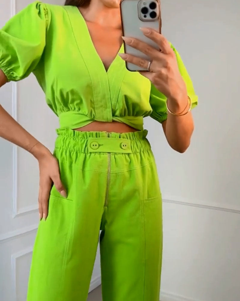 | Product Name | Casual Solid Color V-neck Top & Pants Two-piece Set |